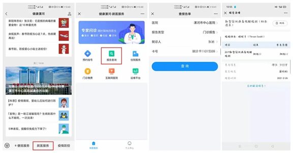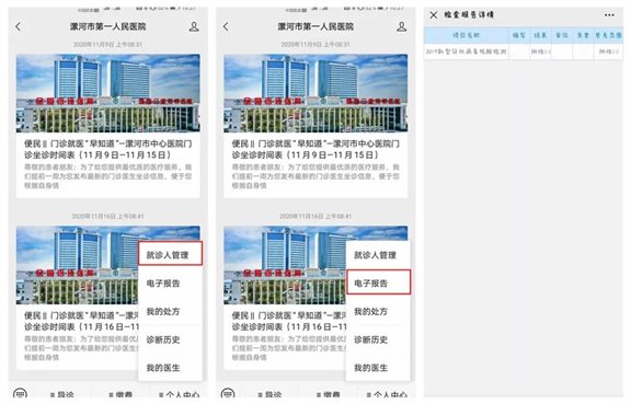 关注“健康漯河”公众号→就诊服务→报告查询→输入个人信息→查询电子报告。