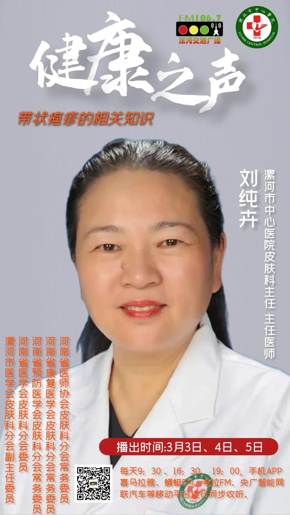 1067健康之声,您的专业健康顾问,我是主持人小桐 ,本节目由漯河交通广播、漯河市中心医院联合制作播出。2月24日——3月2日是由国际老龄联合会发起的带状疱疹关注周,今天我们非常荣幸地邀请到了漯河市中心医院皮肤科主任刘纯卉医生,来和我们聊聊带状疱疹的相关知识 ,您好!刘纯卉:您好,主持人!各位听众朋友们,大家...