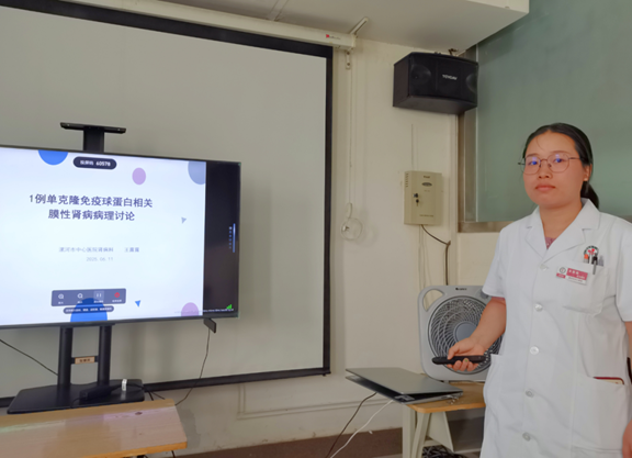 6月11日下午,在2号楼示教室,漯河市中心医院肾病科与金域医学广州肾脏病理诊断中心合作开展了首次“大内肾探-肾脏病理·临床面对面”肾脏临床病理讨论会(CPC),漯河市中心医院肾病科主任杜跃亮、病理科主任曹东辉、病理科主治医师刘娅、血液科副主任医师苑军伟、金域医学广州肾脏病理诊断中心副主任王林,以及肾病科全体医师、进修医师参与了此次临床病理讨论会。