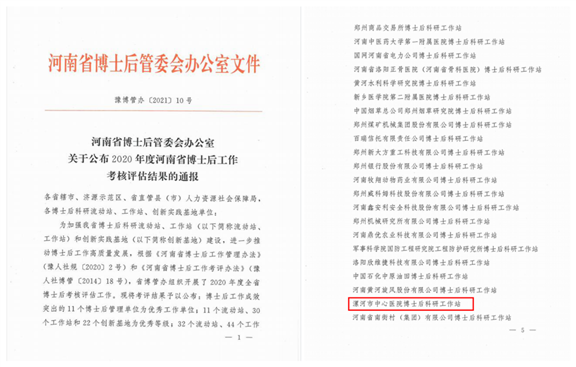 近日,从省人力资源和社会保障厅博管办传来喜讯,漯河市中心医院博士后科研工作站2020年度的考核评估结果为优秀,标志着我院博士后培养水平充分得到了省博管办的肯定。