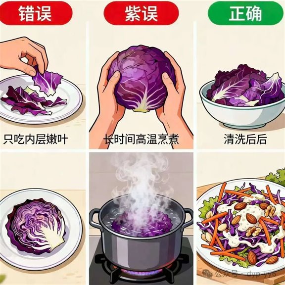 很多人吃紫甘蓝的误区,恰恰浪费了它的营养。误区一是“只吃内层嫩叶”,其实紫甘蓝的外层叶片花青素和膳食纤维含量更高,只要清洗干净完全可以食用;误区二是“长时间高温烹煮”,虽然紫甘蓝耐煮,但煮制超过20分钟会导致维生素C大量流失,建议采用快炒、焯水后凉拌的方式,既能保留营养,又能减少涩味;误区三是“忽略搭配”,紫甘蓝中的铁元素需要维生素C促进吸收,搭配橙子、番茄等食材食用,补铁效果会翻倍。