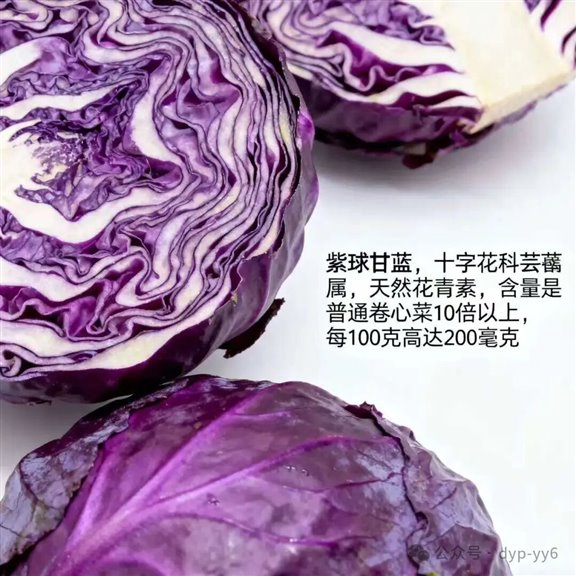 紫甘蓝学名“紫球甘蓝”,属于十字花科芸薹属植物,和卷心菜是近亲,但因品种选育形成了独特的紫色外观和营养构成。很多人误以为它的紫色是人工染色,其实这是天然的花青素在发挥作用——紫甘蓝的花青素含量是普通卷心菜的10倍以上,每100克含量高达200毫克,远超蓝莓、桑葚等公认的“花青素大户”。