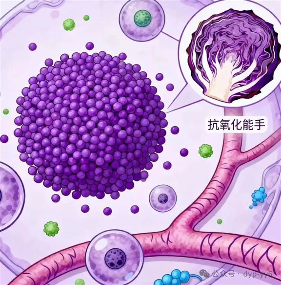 这层紫色花青素可不只是“颜值担当”,更是被现代营养学证实的“抗氧化能手”。它能清除体内自由基,减少紫外线、环境污染对细胞的损伤,延缓皮肤老化;同时还能改善血管弹性,帮助降低血液黏稠度,对心血管健康十分友好。更难得的是,紫甘蓝中的花青素稳定性强,经过烹饪后仍能保留70%以上,比其他富含花青素的蔬果更耐加工。