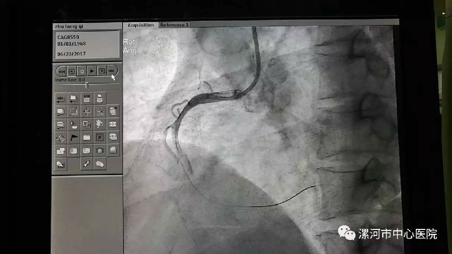 就在血管开通过程中,患者突然出现了心率、血压下降,心率最慢降至20~30次/分,医护人员随即用阿托品针提心率、多巴胺针升血压,患者心率血压渐渐恢复平稳正常。