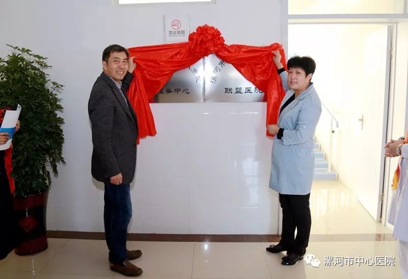 在参会嘉宾的共同见证下,谭占国和王雨霞共同为"漯河市中心医院康复科联盟医院"揭牌。