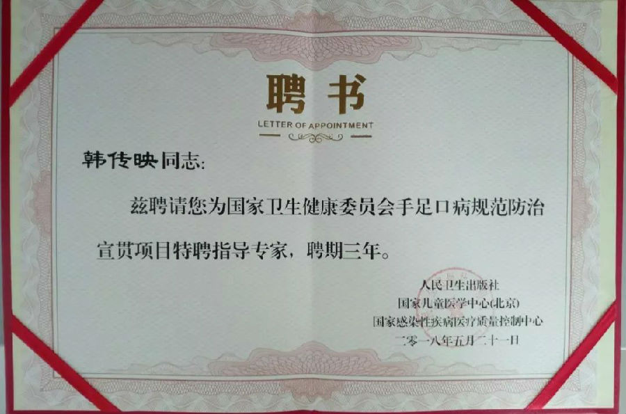 会上,我院被首批授予“国家卫生健康委员会手足口病规范防治宣贯基地”,儿科三病区副主任韩传映被聘为“国家卫生健康委员手足口病规范防治宣贯项目特聘指导专家”。
