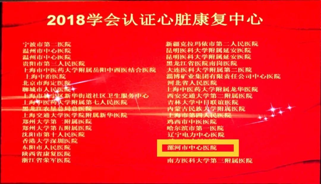心脏康复中心成立两年多来,取得显著成效,得到了国内心脏康复业界的充分肯定。2017年9月,中国心脏联盟授予漯河市中心医院“支架人生俱乐部”,由此医院支架人生俱乐部进入国家队行列。 2017年10月,中心成功承办“中国心脏联盟心血管疾病预防与康复专业委员河南·漯河联盟成立大会暨豫中南首届心脏预防和康复大会”,全国首家地市级心脏预防与康复联盟正式落户我院。 2017年12月,医院荣获中国心脏联盟心脏康复中心质量控制合格认证单位,成为豫中南地区唯一一家通过认证的心脏康复中心,医院支架人生俱乐部被评为全国72家受表扬单位之一。