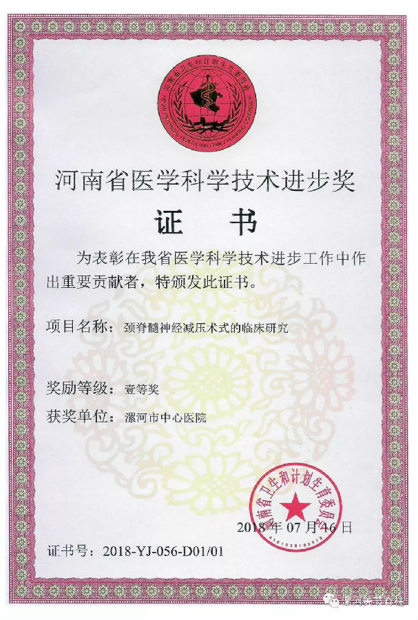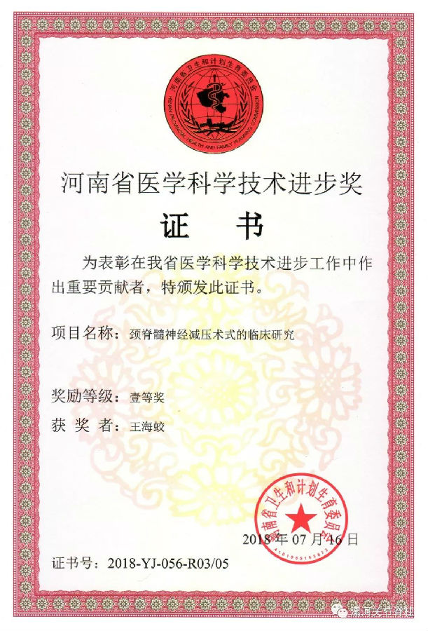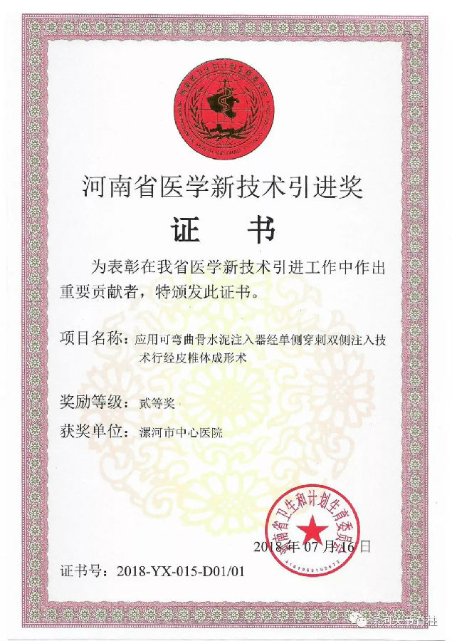 脊柱外科在王海蛟教授的带领下,一直致力于技术和学术的创新,技术实力与科研水平位于省内先进行列,科室2015年被评为漯河市创新性科研团队,2016年被确定为河南省重点学科。