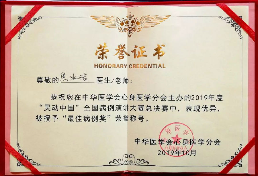会议上举行了2019灵动中国心身同治全国案例演讲总决赛,我院高血压科医师焦冰洁分享的《以精神心理疾病为诱因的高血压》病例报告,荣获"全国病例演讲大赛最佳病例奖"。这也是继2018年获得“全国心身医学病例比赛”最佳病例奖之后,高血压科高血压双心医学团队再次获此殊荣!