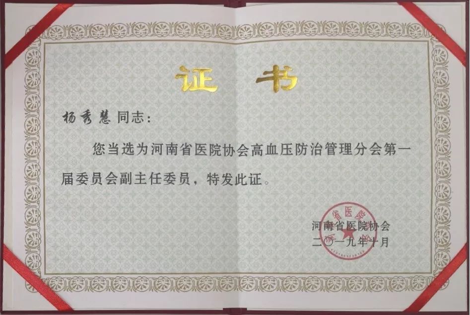 杨秀慧教授表示,此次当选省级学术团体的副主任委员,既是对漯河市中心医院高血压科在高血压防治、新技术新业务开展、学科建设等方面的肯定,更是一种责任和使命。在今后的工作中,漯河市中心医院高血压科将百尺竿头,更进一步,不断强化科室内涵建设,提升科室品牌学科的知名度和影响力,充分发挥科室作为河南省高血压防治中心漯河分中心的优势,加强组织网络建设,推动高血压防治知识在更广范围内的普及,促进全市高血压防治水平共同提升。