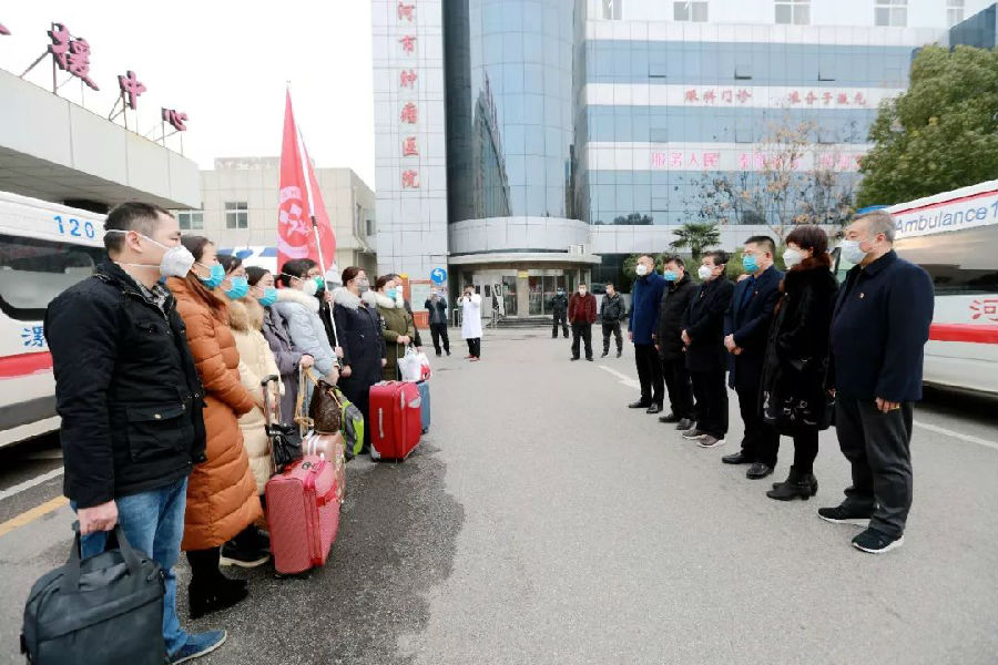 根据漯河市新型冠状病毒感染的肺炎疫情指挥部的安排,漯河市中心医院(漯河市第一人民医院 漯河医专一附院)疫情隔离病区设在市传染病医院。1月27日下午3点,由呼吸与危重症医学科,急救中心,肝病科,耳鼻喉科,风湿血液科,心胸外科,妇科,神经内科一病区9名医护人员组成的漯河市中心医院首批医疗救护队进驻隔离病区。院长王海蛟,党委书记王向良,副院长李耀军、杨秀慧、王进,工会主席崔红领和医务科、护理部负责同志,进驻人员所在科室同事们前来为大家送行。