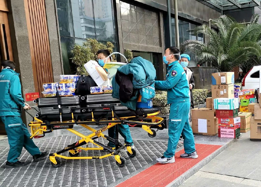 救援车队在省120指挥中心的带领下于下午2点顺利到达武汉市,来不及休息,队员们便开始搬运随车携带物资,腾出救护车医疗仓,上报队员、车辆及设备信息等准备工作,以便随时开始救治和转运重症患者。