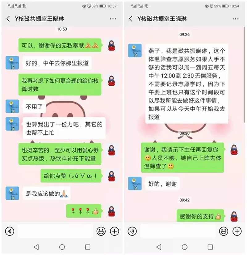 “体温筛查志愿服务如果人手不够我可以周一至周五每天中午12:00-2:30无偿服务,因为要上下班,我想只有这个时间段可以参与,我可以尽我所能做好这件事情。”磁共振科王晓琳说。