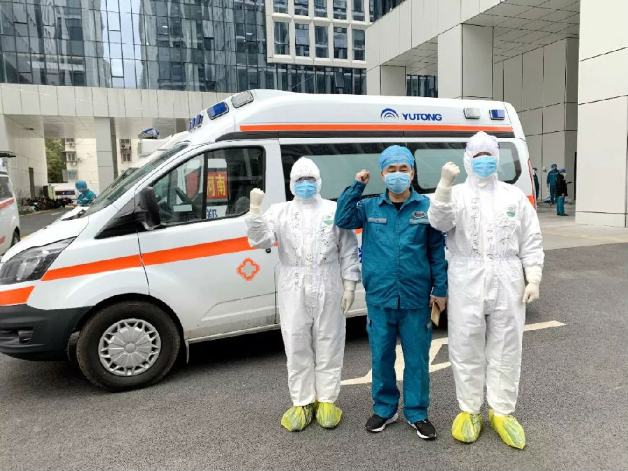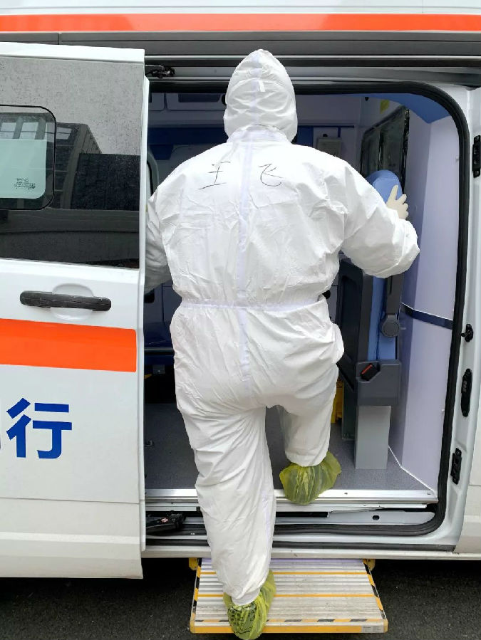10号上午10点,指令像往常一样下达,任务是前往武汉市汉口医院转诊2名老年患者到金银潭医院进一步治疗。到达医院后,王飞迅速对患者进行了初诊,发现他们是夫妻,二人同时感染,大娘病情较重,氧饱和度90%左右且不稳定,呼吸困难,活动受限,属危重病人。两人年纪较大,家人都在隔离,无人照顾,王飞和吴斌二人合力将大娘抬上平车,紧急赶往金银潭医院。
