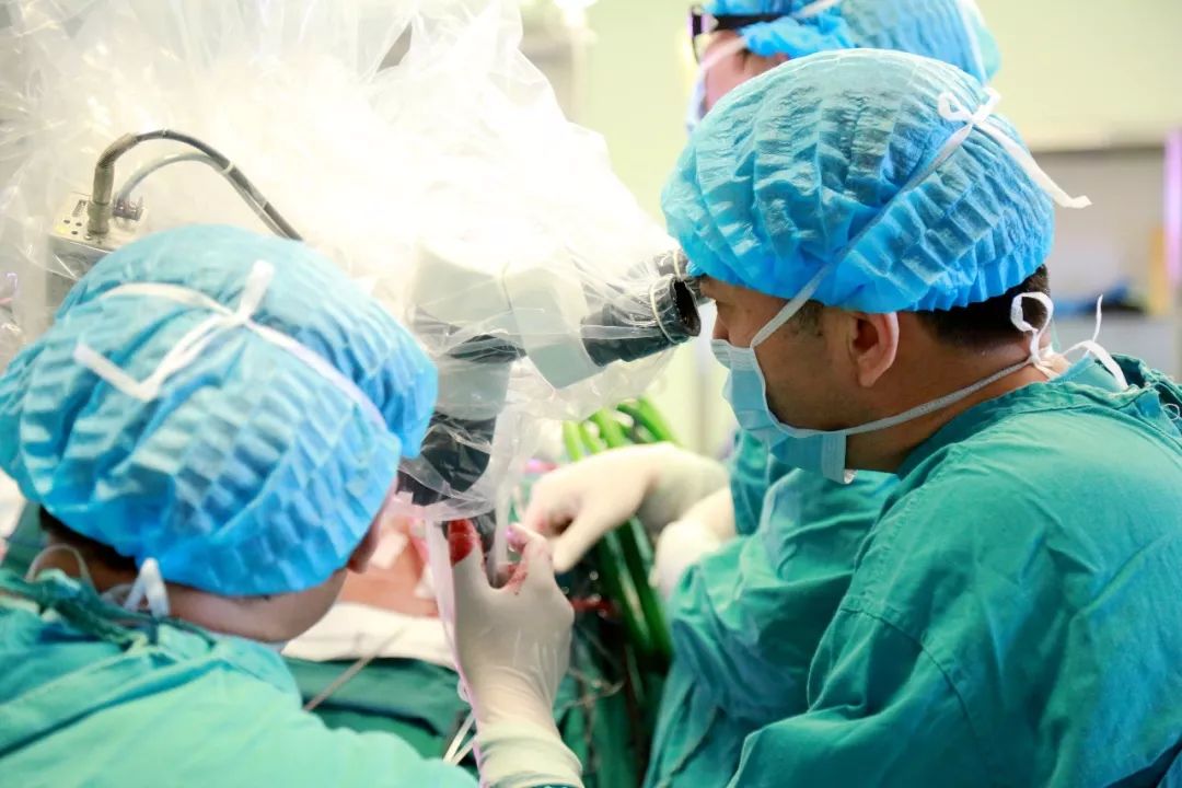 20分钟后,谭占国教授赶到医院,来不及休息,就迫不及待前往手术室,早已待命的医护团队急忙为他更换衣物、消毒。在紧急排除手术禁忌、确保医护人员做好科学防护后,谭占国教授带领神经外科一病区主任袁波、副主任医师邢海涛为患者行开颅手术,“术中发现正常的脑血管和动脉瘤都深藏在血肿当中,而要夹闭动脉瘤就必须理清楚这些血管和动脉瘤位置的关系,再加上患者载瘤动脉血管变异,分三支主要分支(绝大部分人只有两支),动脉瘤位于分支起始部,这就进一步增加了手术的难度与风险!”主治医师邢海涛介绍。