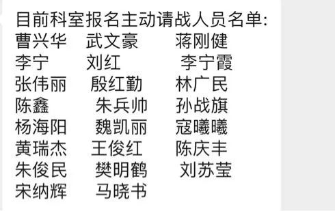 在特殊的日子里,医院号召主动报名参加医院一线防护工作,科室党员团员带头报名,短短两个小时,就有23名科室人员毫无迟疑的踊跃报名。