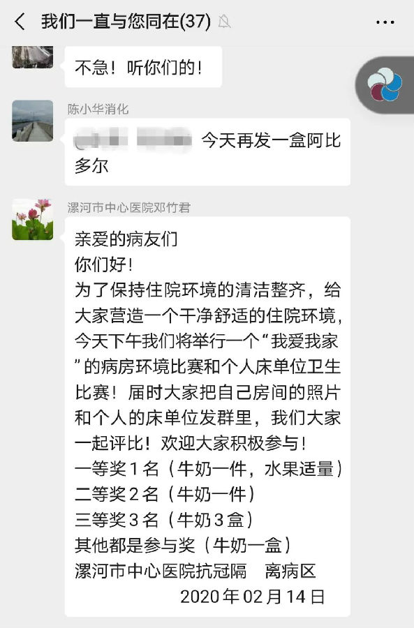 “亲爱的病友们,你们好!为了保持住院环境的清洁整齐,给大家营造一个干净舒适的住院环境,今天下午我们将举行一个“我爱我家”的病房环境比赛和个人床单位卫生比赛!届时大家把自己房间的照片和个人的床单位发群里,我们大家一起评比!”