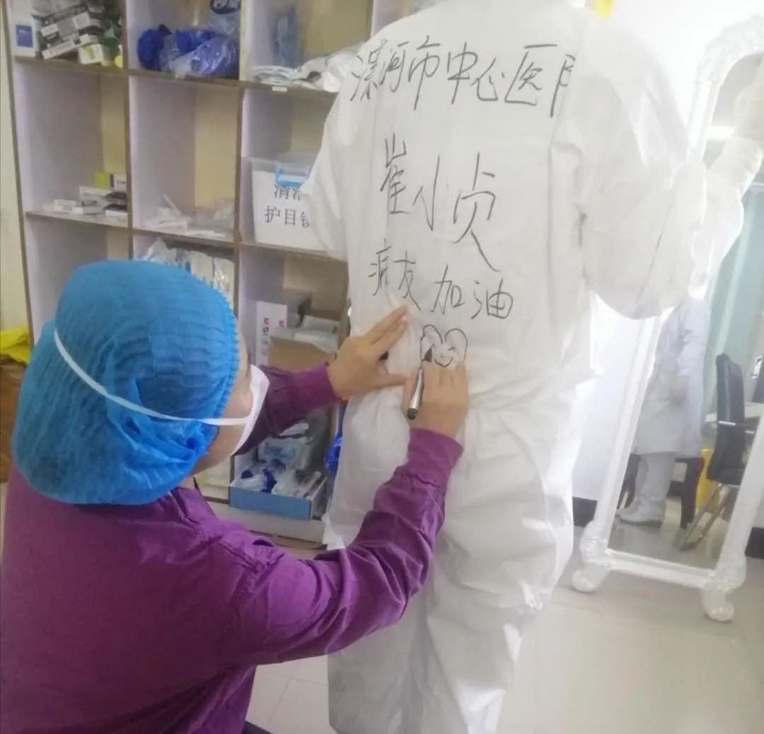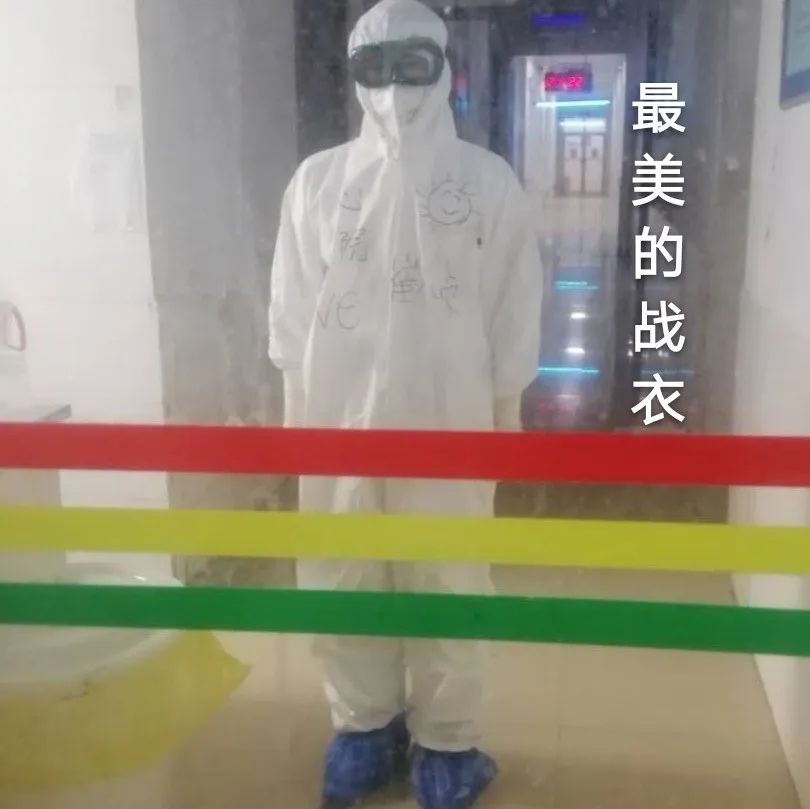 邓竹君护士长为她的战衣上写下鼓励的话语,画上温馨的笑脸,一句加油,一个微笑,代表了一份温暖,一份希望。