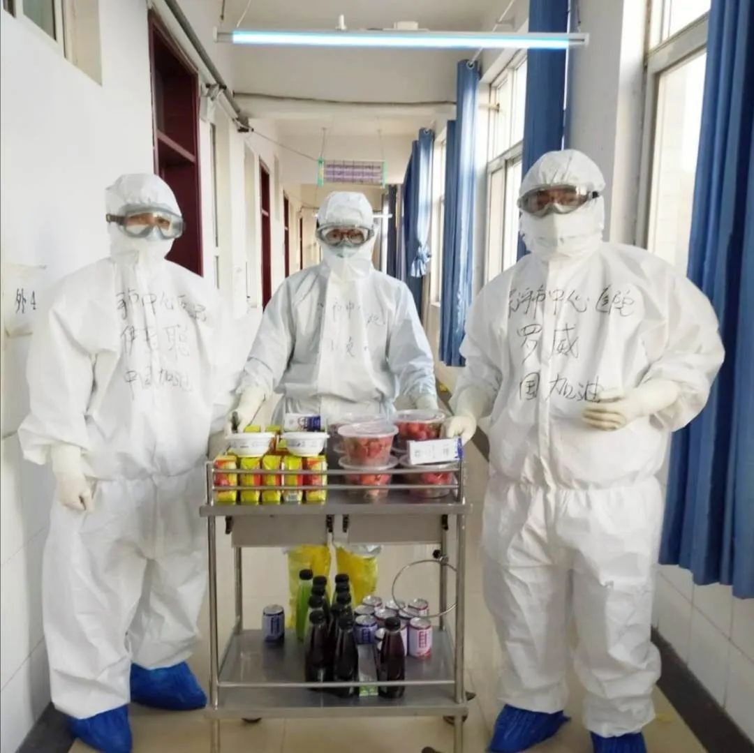 隔离病区的患者,都是新冠状病毒肺炎患者,他们与外界隔离,没有家属的陪护,隔离区的医护人员为他们送去水果、牛奶、粥等,抚慰他们的心灵,我们一直都在,一起共进退。