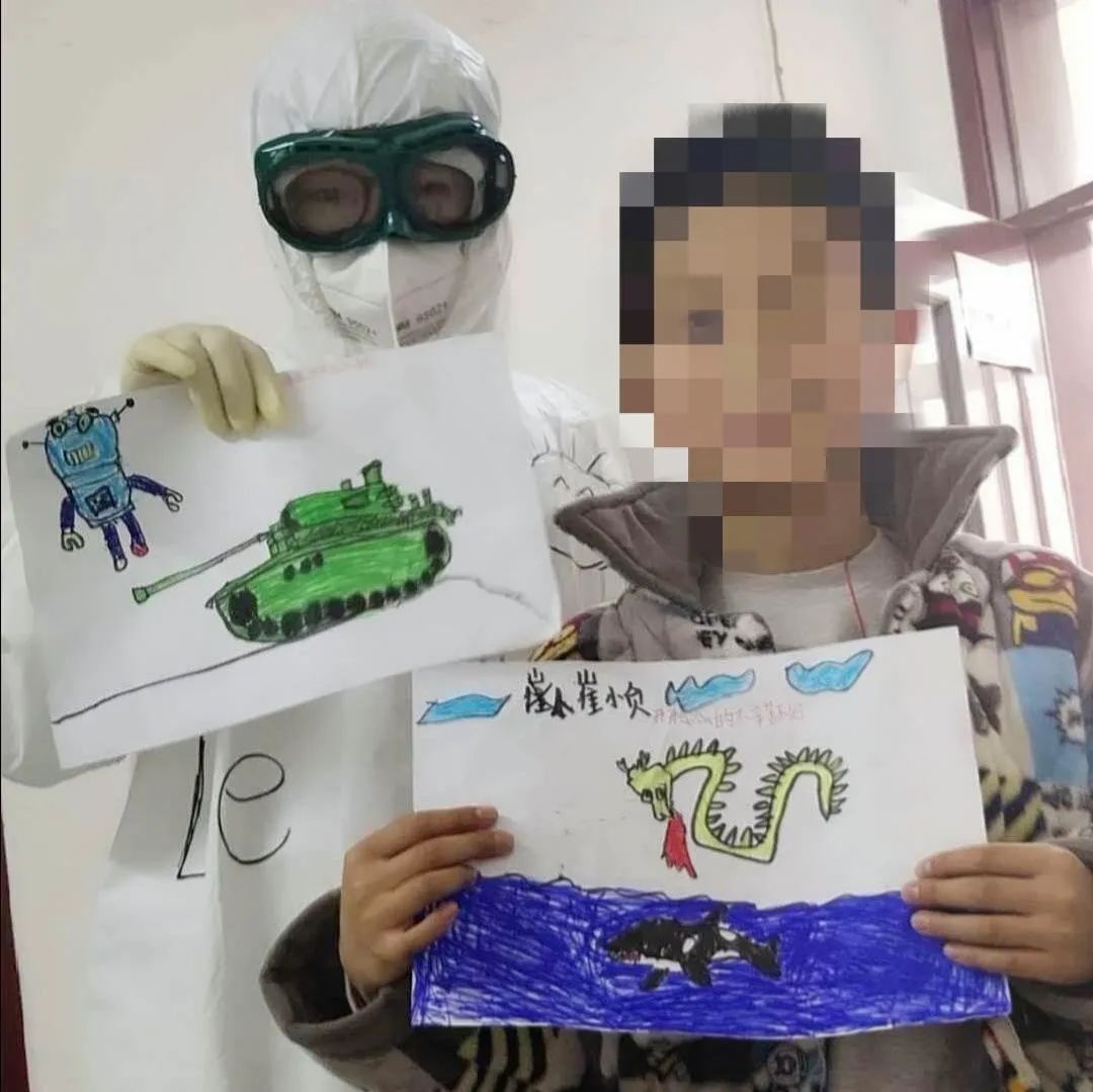 一位住院的小朋友,面对病毒,他没有不开心,而是积极向上,画了两幅温情的画作,送给他心目中最美的护士阿姨,一句“开开心心的不辛苦不lei”,含有拼音的话语,是孩子心中最美好的祝福。