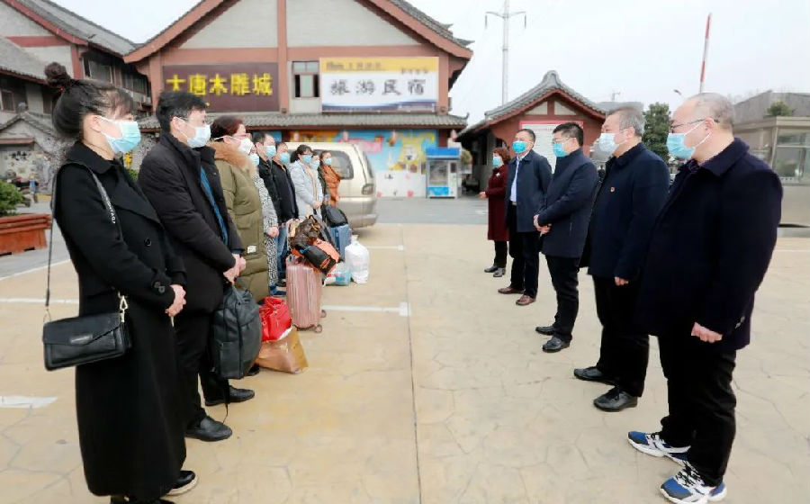 漯河市中心党委书记王向良、副院长王进、工会主席崔红领带领医务科、护理部等相关科室负责人一起前往队员临时住处,迎接英雄们归来,为他们送上了慰问品,感谢他们为抗击疫情作出的贡献。