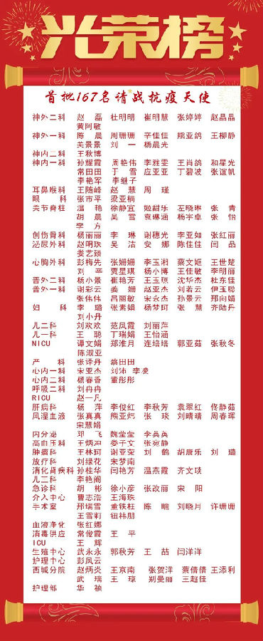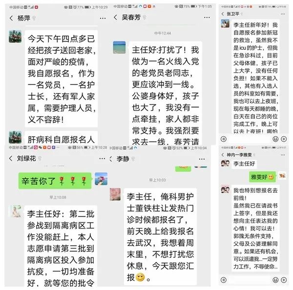 “护士长,我无条件执行医院派的任何政治任务,关键时刻绝不会退缩,如果有必要,前线支援也可以,我父母公婆和丈夫都支持我!”“今天下午4点多已经把孩子送回老家,面对严峻的疫情,我自愿报名,作为一名党员,一名护士长,还有军人家属,需要护理人员,义不容辞!”没想到的是,消息发出后,不到一天的时间,就已经有167名护理工作者争先报名。
