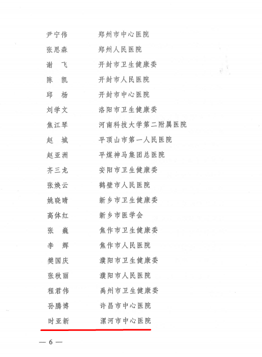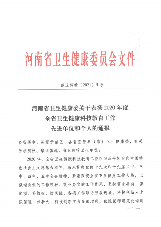 漯河市中心医院科教科科长时亚新荣获2020年度全省卫生健康科技教育工作“先进个人”。