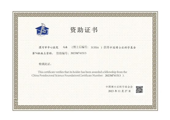近日,中国博士后科学基金会公示了第74批面上资助人员名单,漯河市中心医院与河南大学联合培养博士后马森、张静苑位列其中,喜获立项资助。