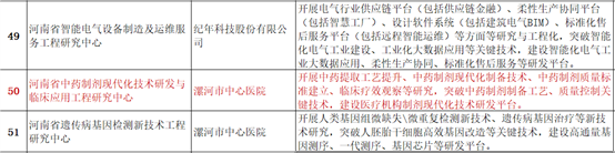 河南省中药制剂现代化技术研发与临床应用工程研究中心于2019年7月获批,依托单位为漯河市中心医院,是积极响应国家《中医药健康服务发展规划(2015-2020 年)》,充分利用漯河市中心医院药学实验室、制剂生产车间与 15 个临床专业有机相结合建成的集中药制剂现代化技术工艺研究、生产与临床疗效观察为一体的省级研发平台,其对中药制剂的研究较高校、药物研究所、药厂等机构,具有得天独厚的优势。旨在开发临床治疗应用及健康管理治“未病”中医药产品,为人民群众提供健康服务。通过工程中心的成立实现中医药理论的提升、现代化应用技术的突破、中医药制剂研发应用人才的培养。