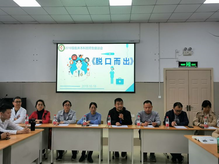 2019年10月18日下午三点,在教学楼一楼2016级本科班教室,举行了一场特殊的师生座谈会。科教科科长时亚新、朱晓璇,医疗系张静、邓海峰,药学系王雁梅,内科教研室教秘王晓丽,外科教研室杨涛,妇产科教研室教秘袁翱龙,儿科教研室教秘张龙真,诊断学教研室王海增,及2016级本科班50名同学参加了本次座谈会。