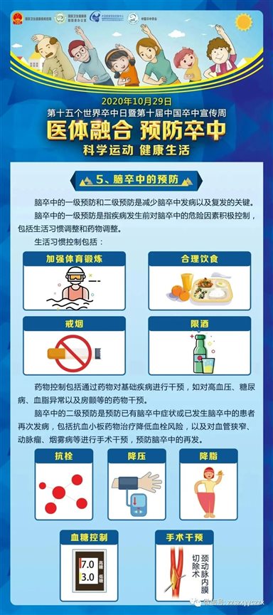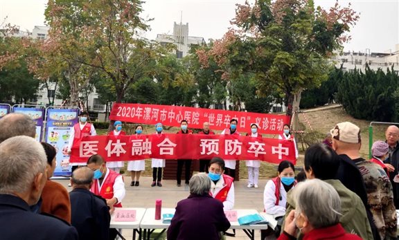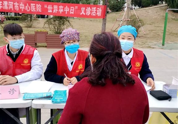 今年10月29日是第15个世界卒中日,主题是“医体融合,预防卒中”,口号为“科学运动,健康生活”。为普及脑卒中相关知识,提高脑卒中早期识别率,倡导健康生活方式,10月28日上午,漯河市中心医院(漯河市第一人民医院 漯河医专一附院)卒中中心副主任、神经内科主任郑春玲,医务科副科长、卒中中心办公室主任窦中伟带领神经内科、神经外科、急救中心、介入科、心内科、内分泌科、高血压科、康复科及脑心健康管理师等专家志愿者团队来到烟厂花园开展“世界卒中日”大型义诊宣传活动。