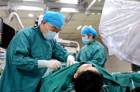 上午8点,蔡继锐为一名阵发性房颤患者进行射频消融手术。上台后仍持续房颤,术中即打停,转为窦律。以往对于房颤患者开展的射频消融手术存辐射多、手术耗时长等问题。此次房颤射频消融手术采用V6和AI指导下的三维高效射频消融术,实现轻松精准定位,甚至做到‘零射线’,孕妇也能实施该手术,我院也是率先在地市级医院中开展此项技术。