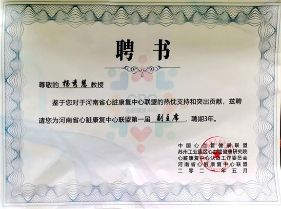 河南省心脏康复联盟成立,漯河市中心医院副院长杨秀慧当选心脏康复联盟副主席,心脏康复中心主任胡新荣任心脏康复联盟委员。