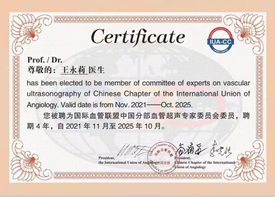 近日,国际血管联盟(IUA)中国分部血管超声专家委员会换届大会在线上召开,漯河市中心医院超声诊断科住院部主任王永莉教授当选为国际血管联盟(IUA)中国分部血管超声专家委员会委员。