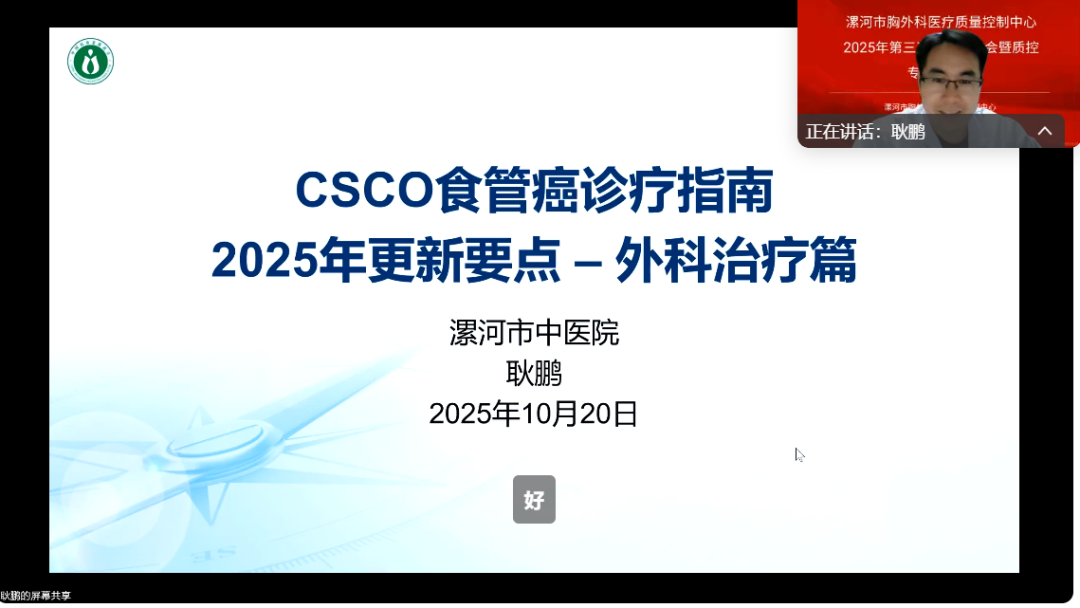 10月20日,漯河市胸外科医疗质量控制中心成功召开2025年第三次质控工作会暨质控专题培训会。本次会议采用线上形式举行,中心全体委员及各相关单位胸外科业务骨干云端相聚,共同参与了此次培训交流与工作部署。