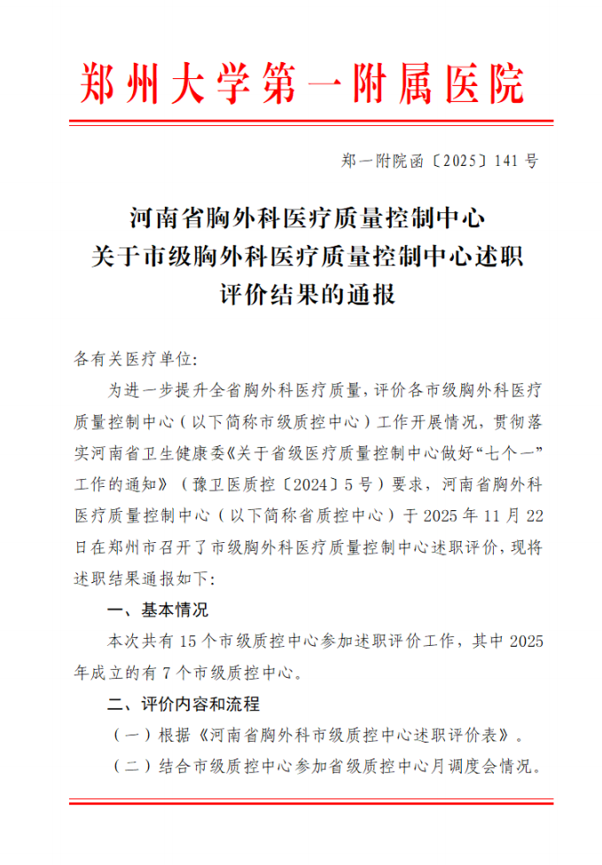 近日,河南省胸外科医疗质量控制中心发布2025年度市级胸外科医疗质量控制中心述职评价结果通报。漯河市胸外科医疗质量控制中心凭借扎实的工作成效和规范有序的质控管理,荣获“优秀市级胸外科医疗质量控制中心”称号,成为全省获此殊荣的三个市级中心之一。
