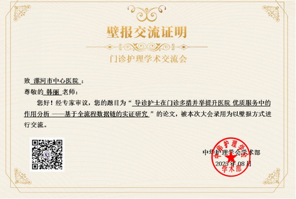 韩丽撰写的论文《导诊护士在门诊多措并举提升医院优质服务中的作用分析——基于全流程数据链的实证研究》,经中华护理学会专家组严格评审,成功被大会录用,并以壁报形式进行学术交流。该研究从实证角度深入分析了导诊护士在全流程服务中的关键作用,体现了市中心医院在门诊服务优化与数据化管理的先进理念。