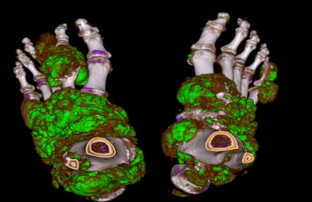 痛风石是痛风结节的成熟形态,常表现为皮下或关节周围的硬结。能谱CT不仅能够清晰显示痛风石的形态、大小及位置,还能通过物质分析技术判断其成分,为治疗方案的制定提供科学依据。此外,能谱CT还能监测痛风石在治疗过程中的变化,评估治疗效果。