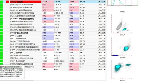 近日,一名66岁女性患者王女士(化名)由于反复发烧2个多月来到我院呼吸科门诊就诊,自从新冠疫情爆发以来,老百姓们对于这个“超级感冒”似乎已经习以为常,但是王女士反反复复不见好转的发烧也给她带来了很大的困扰。来到我院呼吸科以后,门诊医生为她开具了血常规检查,常规结果很快出来了,白细胞计数51.78×10^9/L,淋巴细胞比例79.9%,严重超出了正常范围,我立即找到该份样本查看血常规仪器散点图及报警信息。