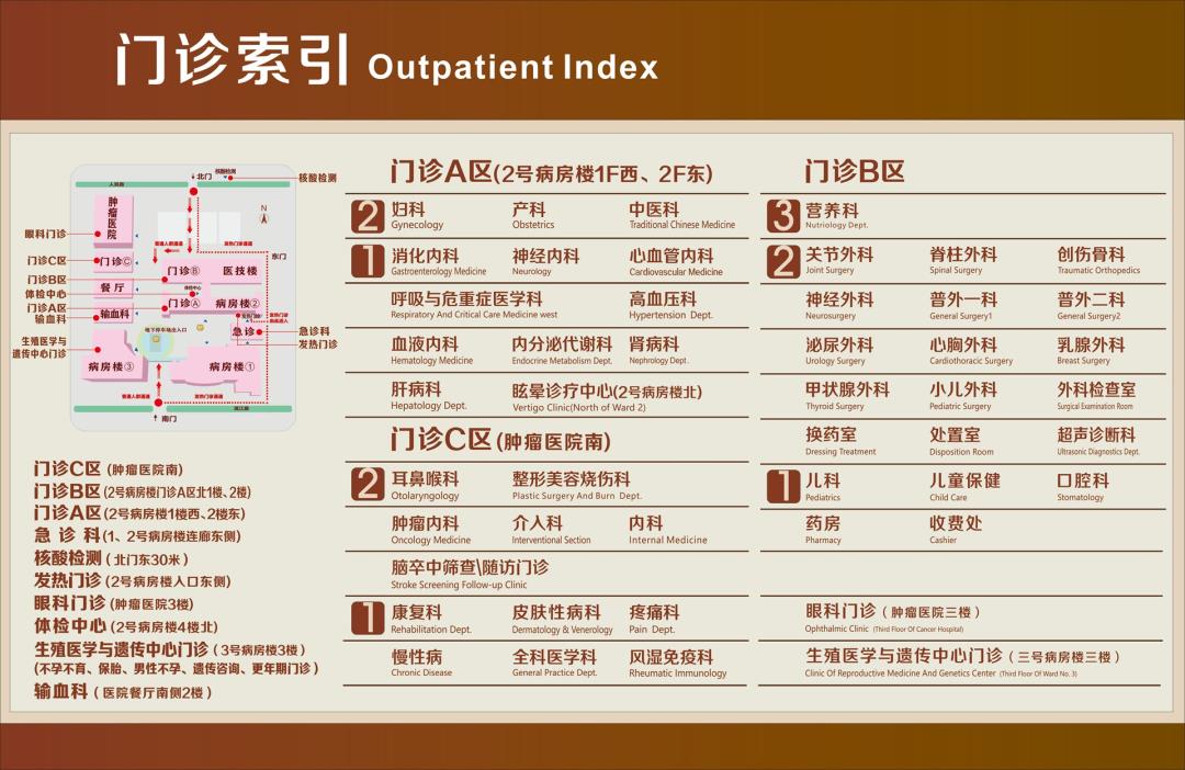 门诊A区: 门诊A区位于2号病房楼1楼西、1楼北和2楼东。