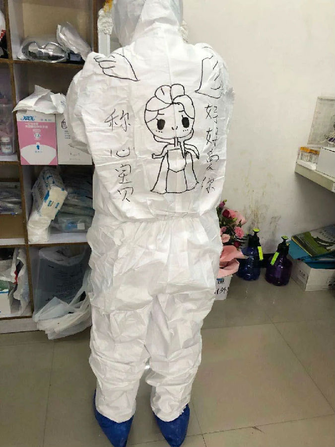 妈妈,您和叔叔阿姨穿着厚厚的防护服,我已经分不清您的脸,可我认得出你身上画的艾莎公主,和我的公主裙一样漂亮。爸爸说,病毒很厉害,您一定要保护好自己,多多吃饭好好睡觉才有力气打败它,消灭它!妈妈,像笨笨的企鹅,真好看!