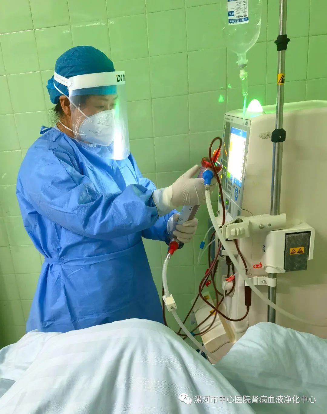 接到漯河市疫情指挥部电话,漯河市中心医院血液净化室要接诊封控区和黄码透析病人!在院领导、医务科、护理部、感染办的指导下,血液净化中心主任杜跃亮和护士长周瑾经过多次沟通,分析研判科室当前实际工作情况,既要保证一百二十多个长期固定病人透析充分和安全,又要做好封控区、黄码透析病人的接诊工作。科室迅速制定出接诊流程,每名医护人员开始熟记,点对点交接、错峰、末班、单间、防护、终末消毒一个一个流程都熟悉掌握。同时紧急联系工程师调试水机,加班加点为封控区病人治疗。