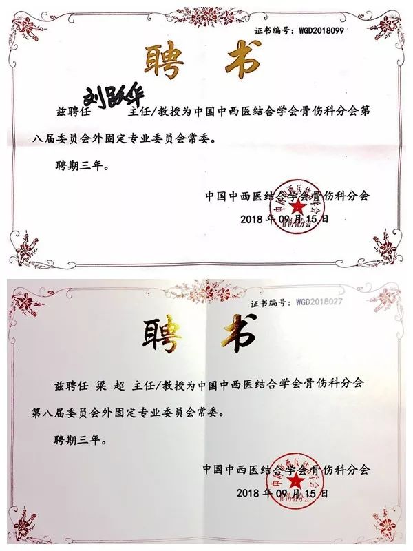 在本届大会上,各专业委员会进行了换届工作,我院创伤骨科主任刘跃华、副主任医师梁超当选为“中国中西医结合学会骨伤科分会第八届委员会外固定专业委员会常委”。