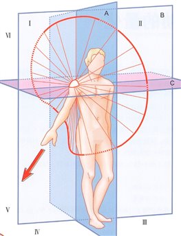 首先,要对自己肩关节的活动范围有一定的了解,肩关节的活动范围极大,它围绕三个主轴(冠状面、矢状面、横断面)在做环绕运动,手臂在空间中划出了一个巨大的立体圆锥形,这个圆锥形的顶点就在我们肩关节的中心。了解了活动范围之后再与健侧对比进行自测,有没有明显的活动范围减少或过大。