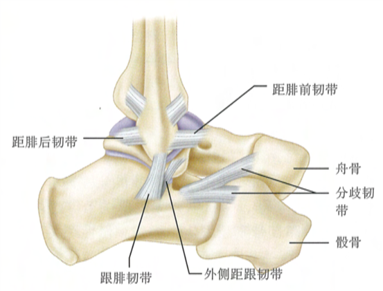 踝关节的外侧韧带复合体是最容易受伤的韧带,包括距腓前韧带(anterior talofibular ligament, ATFL)距腓后韧带(posterior talofibular ligament, PTFL)和跟腓韧带(calcaneofibular ligament, CFL)。在外侧韧带复合体中,距腓前韧带最为薄弱,因此最常受累,距腓后韧带较粗壮,解剖位置较深,损伤较少