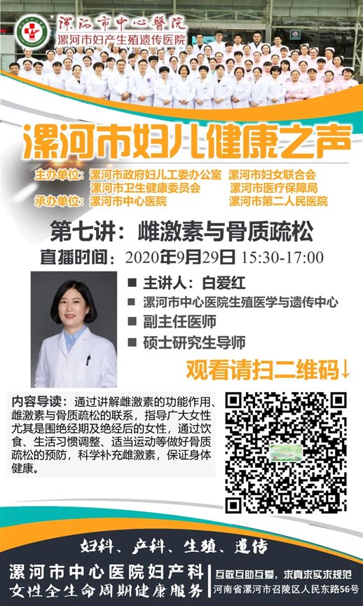 健康的体魄是人生的第一财富,是家庭和睦安康、社会文明和谐的基石。2020年的新冠肺炎疫情,让我们更加深刻地认识到健康重要性。为贯彻健康中国战略,落实全国、省市“家家幸福安康工程”,漯河市政府妇儿工委办、漯河市妇联、漯河市卫健委、漯河市医保局联合开通妇儿健康之声专栏,由漯河市中心医院、漯河市第二人民医院承办,围绕妇女儿童关注的健康话题,全年计划开办10期,通过线上直播形式普及健康知识,提升健康意识,促进家庭幸福安康。