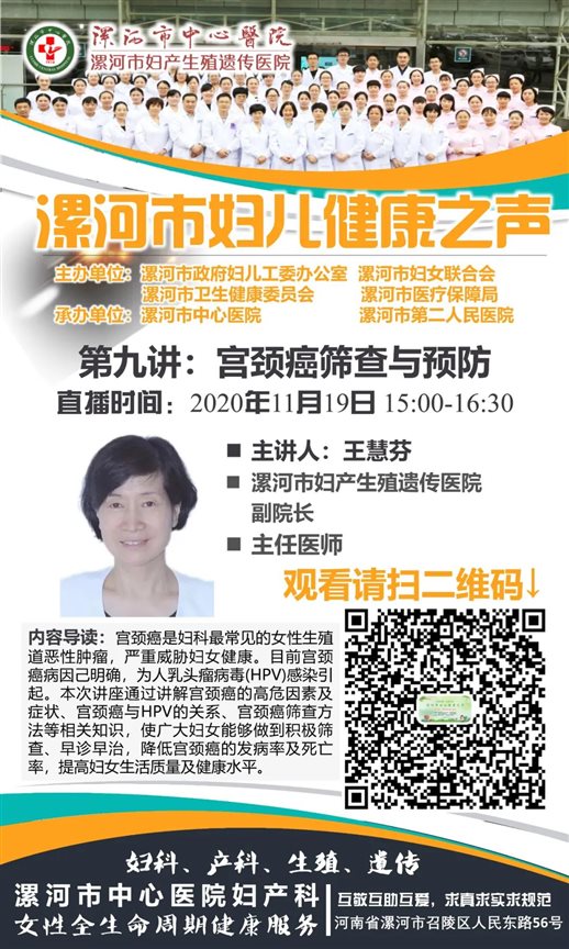 健康的体魄是人生的第一财富,是家庭和睦安康、社会文明和谐的基石。2020年的新冠肺炎疫情,让我们更加深刻地认识到健康重要性。为贯彻健康中国战略,落实全国、省市“家家幸福安康工程”,漯河市政府妇儿工委办、漯河市妇联、漯河市卫健委、漯河市医保局联合开通妇儿健康之声专栏,由漯河市中心医院、漯河市第二人民医院承办,围绕妇女儿童关注的健康话题,全年计划开办10期,通过线上直播形式普及健康知识,提升健康意识,促进家庭幸福安康。