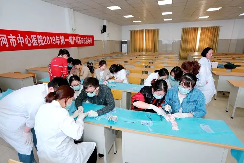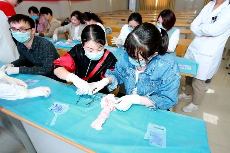 4月24日,产科成功举办第一期会阴缝合术模拟培训班,产科主任崔利娜带领30余名产科医师及助产士在动物标本上“飞针走线”,锤炼会阴缝合技术。