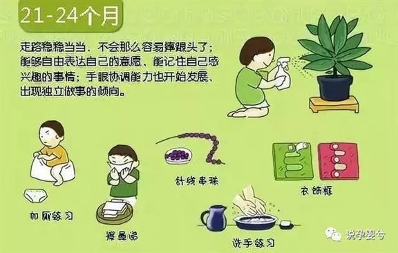 能够独立的去做一些事情,像是洗手、上厕所之类的;手眼协调能力会进一步的加强;能够帮助做一些简单的家务,比如浇花、擦桌子等等。
