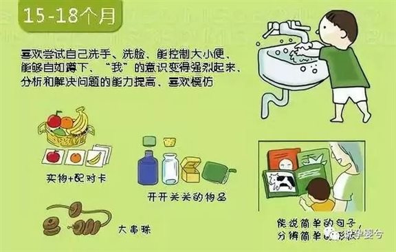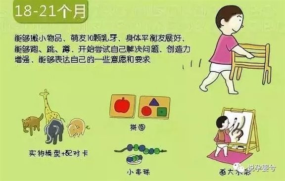 能够搬动小的物品,身体的平衡力很好,能够开始尝试自己去解决问题,并且表达出自己的意愿和要求。